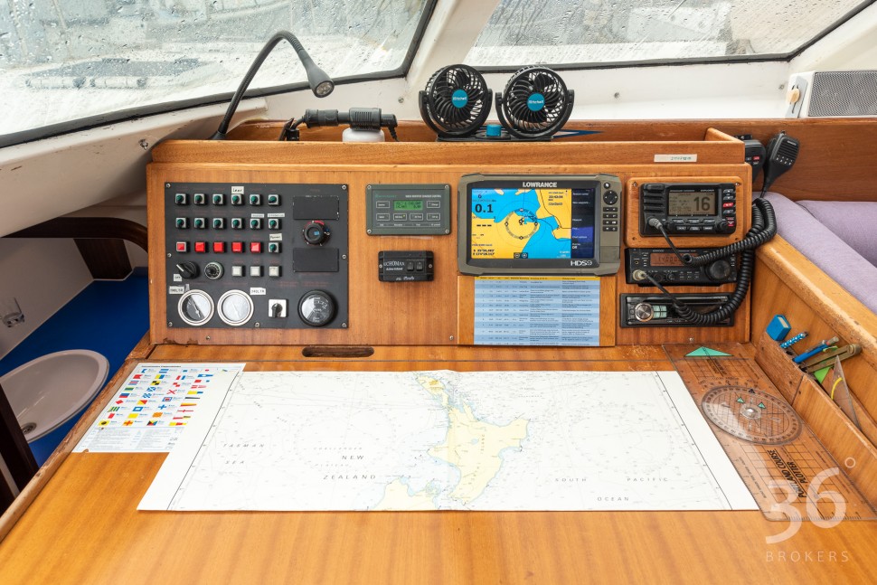 Inside, the galley is on your right hand facing back and a large saloon invites you to seat forward. Chart table faces forward on the left. The big windows offer plenty of light and visibility.