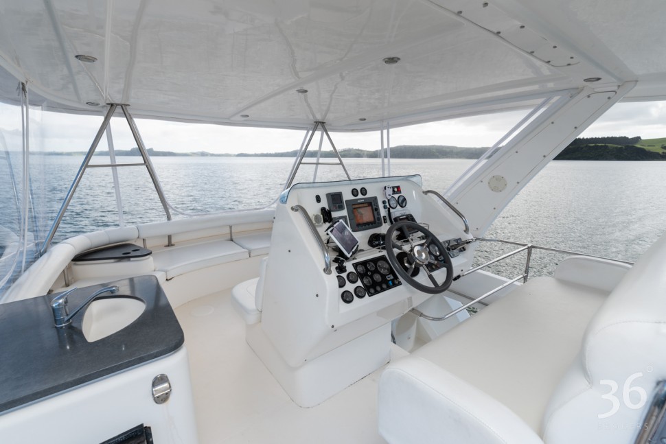 The side decks are extremely wide for a yacht this size, with a solid deck between the bows giving immense floor space, and a high stainless tube guard rail providing safety whilst underway. Her flybridge is a game-changer, and becomes the living area giving the crew a commanding view of your surroundings perfect for socializing with your guests while you navigate new anchorages.