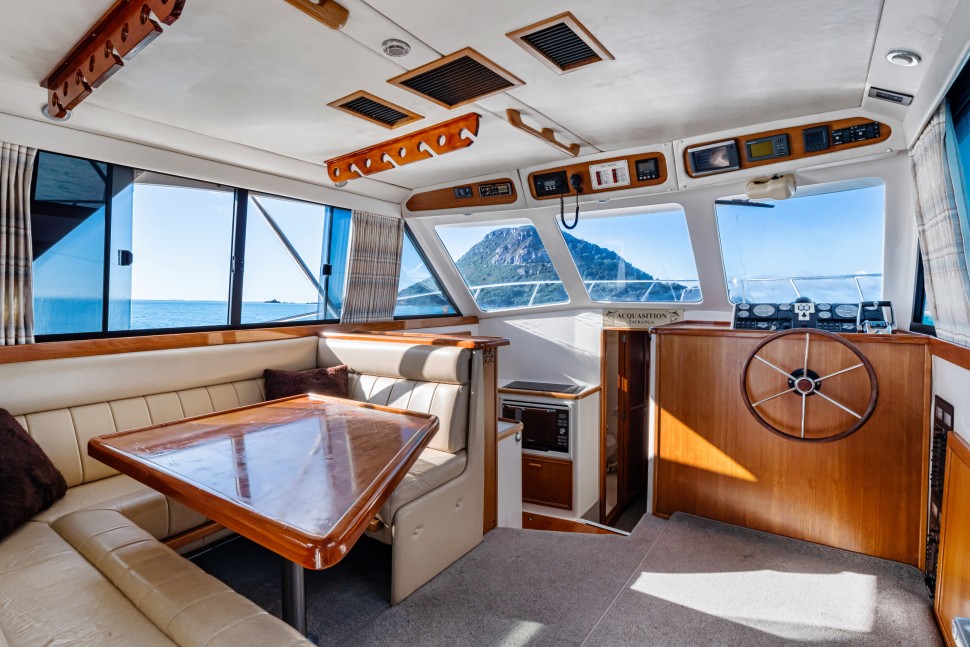 Acquasition is a game-fishing dream, coming rigged and ready featuring a dedicated cockpit with everything anglers desire: tuna tubes, insulated bait boxes, a deep-capacity freezer, and game poles. The transition from the spacious cockpit to the saloon is seamless, creating a free-flowing indoor-outdoor living space. A spacious mid-galley is equipped with a 2-burner induction stove, oven, and microwave.